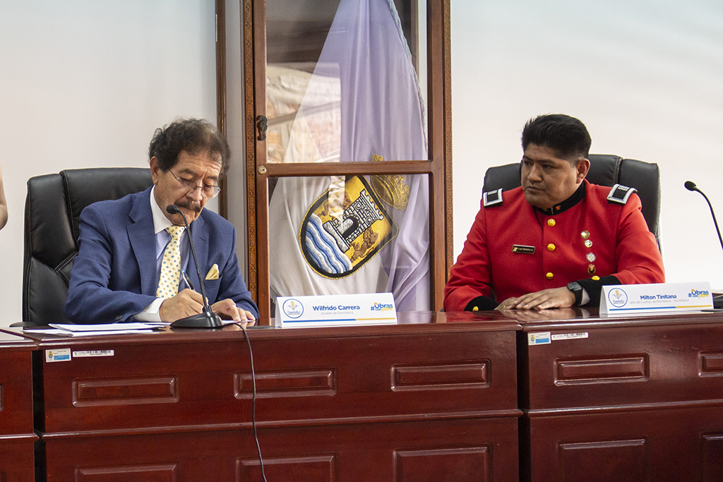 A mediodía, en la Sala de Sesiones del Concejo se llevó a cabo la firma de la escritura de donación de dos lotes de terreno, a favor del Cuerpo de Bomberos de Rumiñahui y el Registro de la Propiedad y Mercantil.