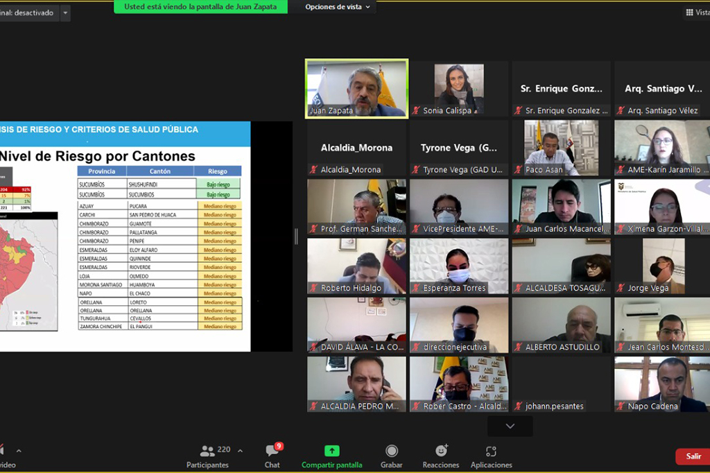 Los alcaldes de la Asociación de Municipalidades Ecuatorianas mantuvieron una reunión de trabajo con miembros del Comité de Operaciones de Emergencia, COE Nacional para analizar la situación de los cantones frente al aumento de contagios, en el país.