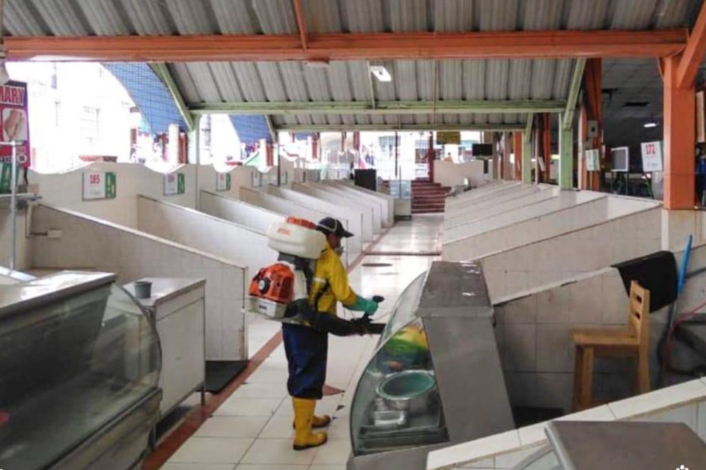 2- Se realiza desinfección permanente en los centros de comercio municipales, Plaza César Chiriboga, Mercado Cerrado Turismo; espacios de atención al ciudadano en instalaciones municipales, para resguardar la salud de la comunidad.