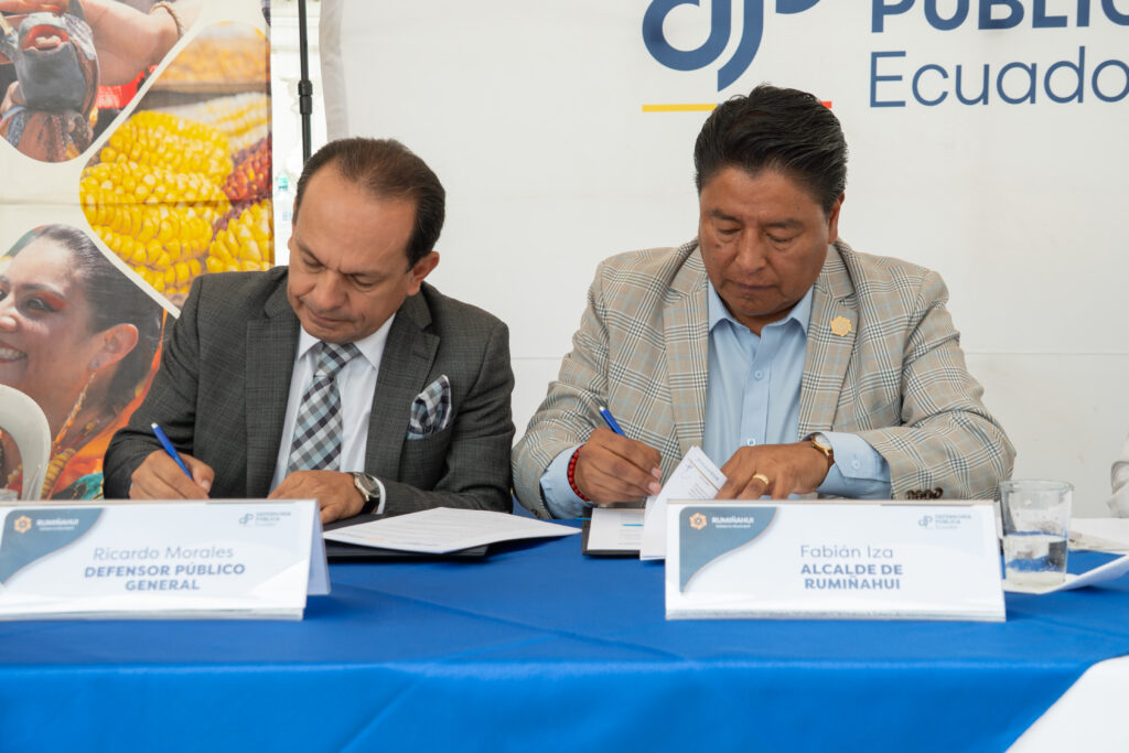 Este jueves 9 de abril, en Villa Carmen, el Gobierno Autónomo Descentralizado Municipal de Rumiñahui y la Defensoría Pública del Ecuador suscribieron un convenio de cooperación para fortalecer el acceso gratuito y oportuno a la justicia.